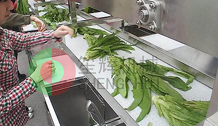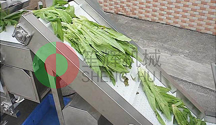 原材料輸送機(jī)把待處理物料(葉菜,土豆,蘿卜等)提升輸送到自動(dòng)流水式工作臺(tái)
