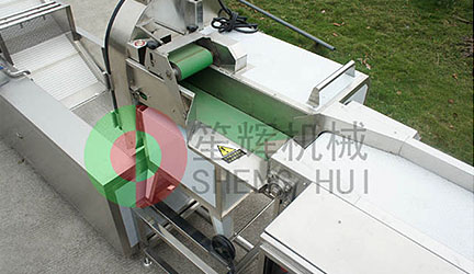 變頻調(diào)速切菜機(jī)與上層輸送帶無縫對(duì)接,按烹飪規(guī)格對(duì)物料進(jìn)行切割。